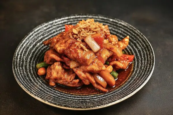 + Free DeliveryCrispy chicken with chilli jam capsicum, onion, shallot, cashew nut